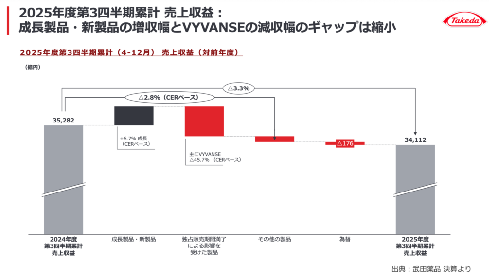 武田の2025年度Q3決算では、前年同期比で減収(-3.3%)